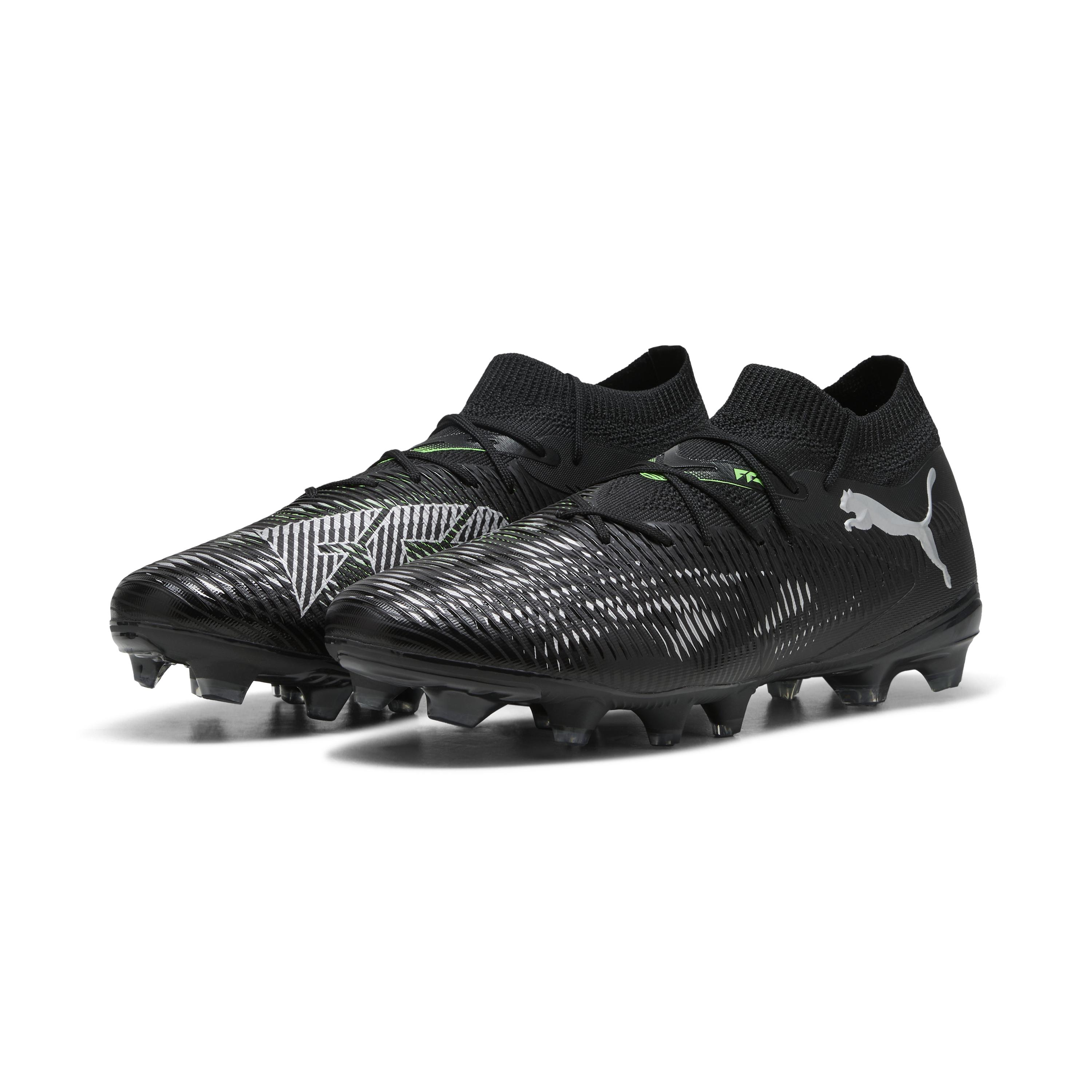 Der PUMA Future 8 Match AG FG ist ein Fußballschuh für Herren, der speziell für den Einsatz auf festen Naturböden sowie Kunstrasen (4G) entwickelt wurde. Das Obermaterial besteht aus einem weichen, leichten Mesh mit einem dehnbaren Strickkragen, der eine flexible und sichere Passform garantiert. Ein Stützband über dem Mittelfuß sorgt für zusätzlichen Halt und Stabilität, die innovative GripControl-Technologie verbessert die Ballkontrolle erheblich. Die Außensohle verfügt über ein spezielles Stollendesign mit kreisförmiger Stollenkonfiguration, das schnelle Drehungen und 360-Grad-Agilität erlaubt und somit das agile Manövrieren auf dem Spielfeld unterstützt. Der Schuh ist normal bis breit geschnitten und kann je nach Vorliebe mit oder ohne Schnürsenkel getragen werden. Zudem ist er aus mindestens 20 % recycelten Materialien gefertigt, was einen nachhaltigen Aspekt unterstreicht. Das Design kombiniert schwarze Grundfarbe mit grünen Akzenten, ergänzt um das bekannte PUMA-Logo und FUTURE-Branding. Die Kombination von innovativer Technik und Komfort macht diesen Schuh besonders geeignet für kreative Spielmacher und anspruchsvolle Fußballspieler, die auf festen und künstlichen Untergründen optimale Performance suchen.
