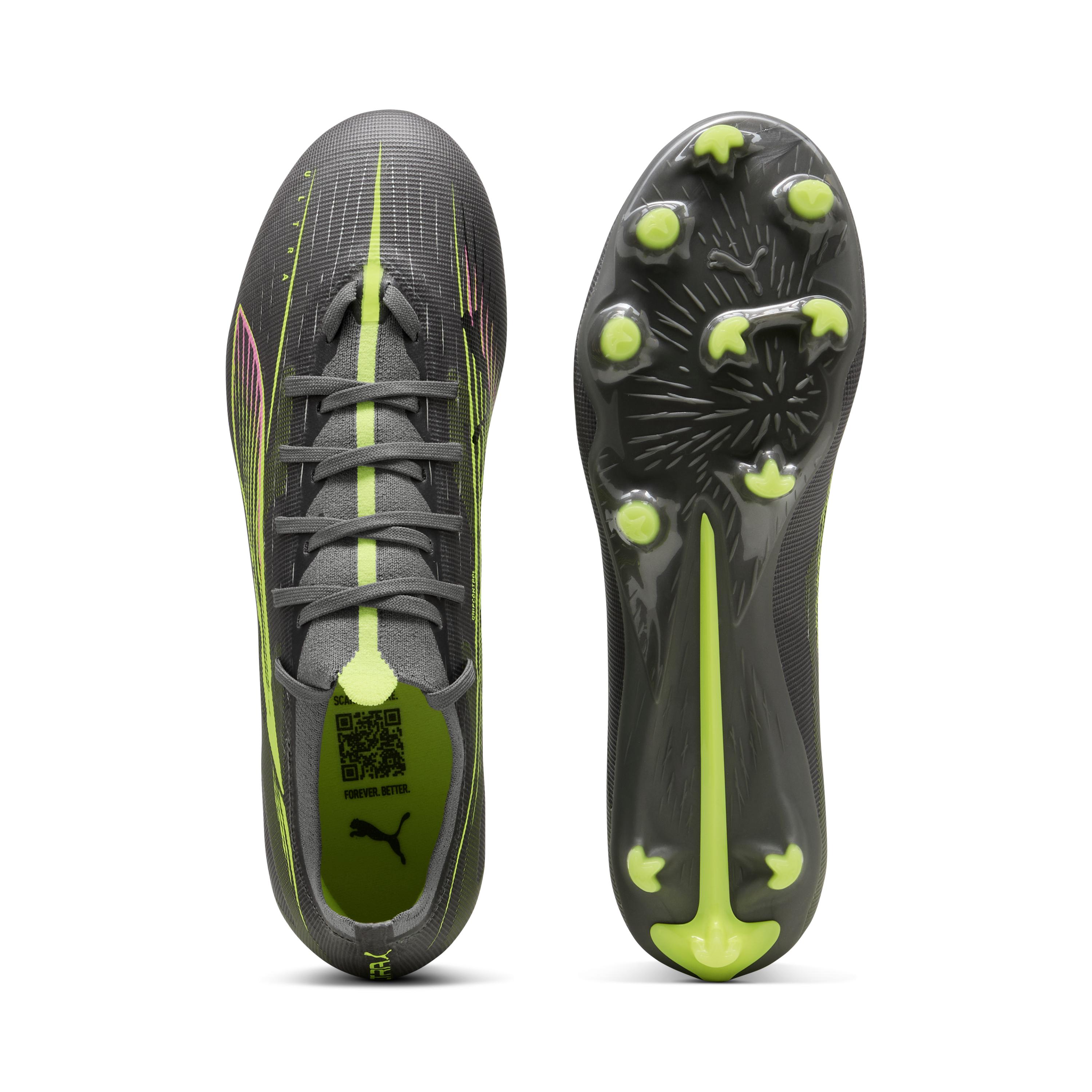 Der PUMA Ultra 5 Match FG AG ist ein leichter Herren-Fußballschuh, der speziell für feste Naturböden und Kunstrasen (4G) entwickelt wurde. Er verfügt über eine innovative SPEEDSYSTEM-Außensohle, die ein federndes Carbonfasermaterial nutzt und eine besondere Stollenanordnung bietet, um explosive Beschleunigung und optimale Energierückgabe zu ermöglichen. Ergänzt wird diese durch die markeneigenen FastTrax-Stollen sowie drei abgerundete Stollen an den Außenseiten, die für hervorragende Traktion auf verschiedenen Spielflächen sorgen und schnelle Richtungswechsel erlauben. Das Obermaterial besteht aus atmungsaktivem und leichtem Mesh mit synthetischen Overlays, stabilisiert den Fuß mit einem Leicht-Supportrahmen und ist mit der GripControl-Beschichtung versehen, die eine entscheidende Ballkontrolle und präzise Schüsse unterstützt. Der Schuh bietet eine normale bis schmale Passform und besteht zu mindestens 30 % aus recycelten Materialien, was ihn umweltfreundlicher macht. Neben der hohen Funktionalität zeichnet sich das Design durch das PUMA-Logo und den charakteristischen Formstrip aus.