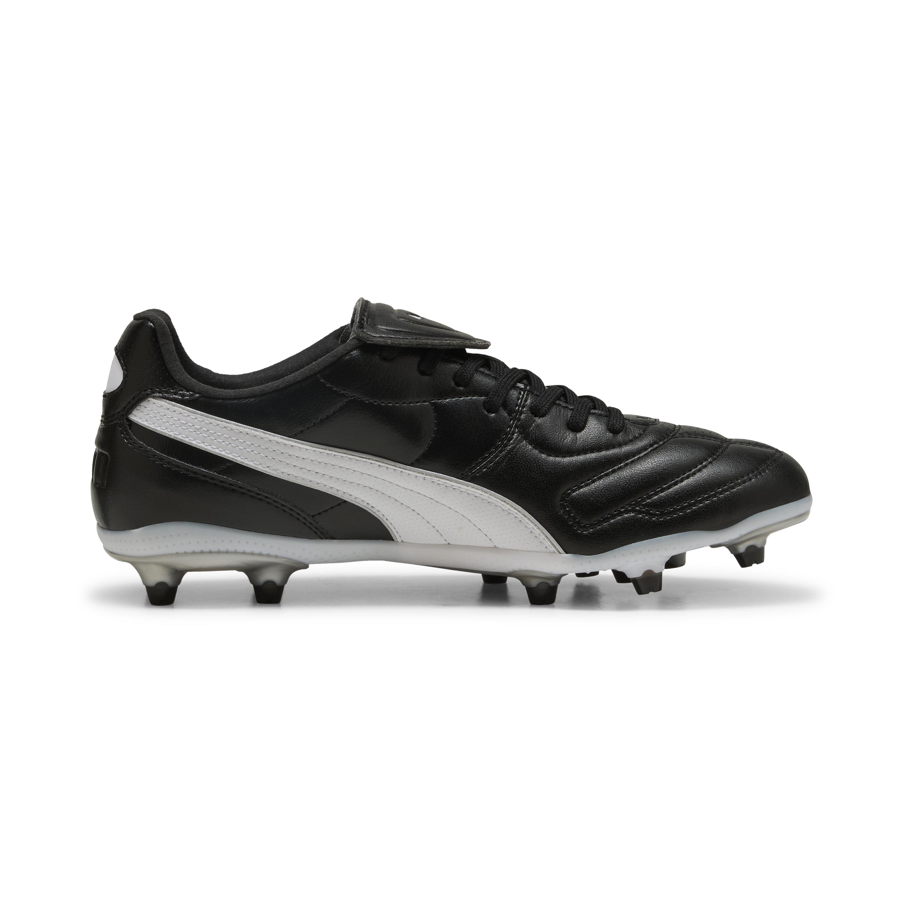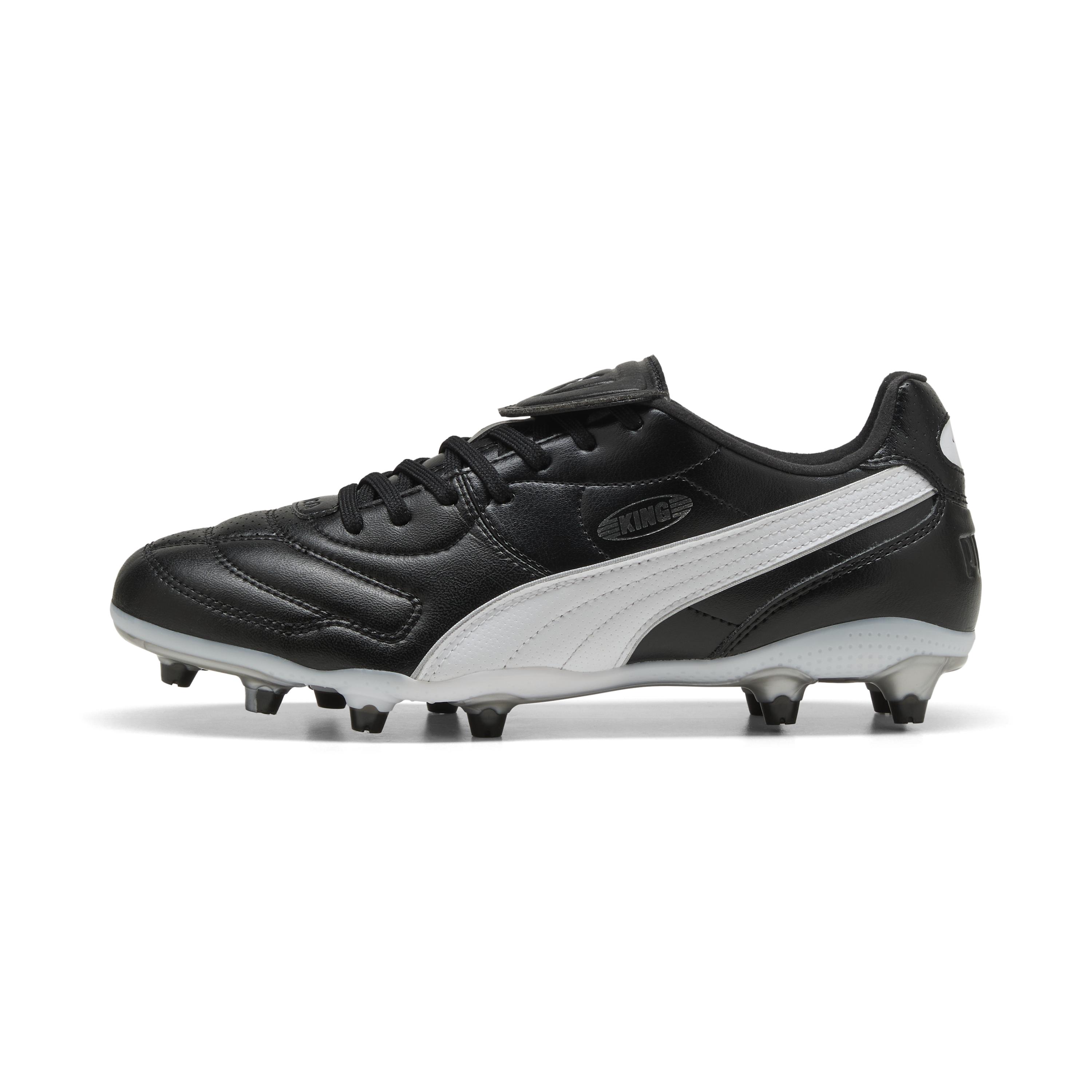 Der PUMA King Liga FG AG ist ein klassischer Fußballschuh, der Tradition und moderne Innovation perfekt verbindet. Das Obermaterial besteht aus dem revolutionären, nicht-tierischen K-BETTER Material, das mindestens 30 % recycelte Materialien enthält und eine nachhaltige Alternative zu Leder bietet. Der Schuh ist speziell für Spiele auf festen Böden und Kunstrasen entwickelt und verfügt über eine leichte Peba-Außensohle mit einer konischen Stollenkonfiguration, die für optimalen Halt und Traktion sorgt. Die klassische KING-Liga vereint ikonische Details wie die Umschlagzunge und Ziernähte mit einem sportlichen, zeitlosen Design. Das textile Innenfutter garantiert eine angenehme Passform, während die verstärkte Fersen- und Zehenpartie Schutz und Stabilität bietet. Der Schuh ist mit einer traditionellen Schnürung ausgestattet, hat eine runde Zehenform, eine normale Weite und ist in der Farbe Schwarz mit weißen und silbernen Akzenten erhältlich. Dieses Modell eignet sich hervorragend für Spieler, die auf weichen und tiefen Böden Kontrolle, Komfort und eine zuverlässige Traktion benötigen. Die Innensohle ist herausnehmbar, was zusätzliche Anpassungsmöglichkeiten bietet. Insgesamt ist der PUMA King Liga ein hochwertiger Schuh für ambitionierte Fußballspieler, der Komfort, Stil und Nachhaltigkeit in einem klassischen Design vereint.
